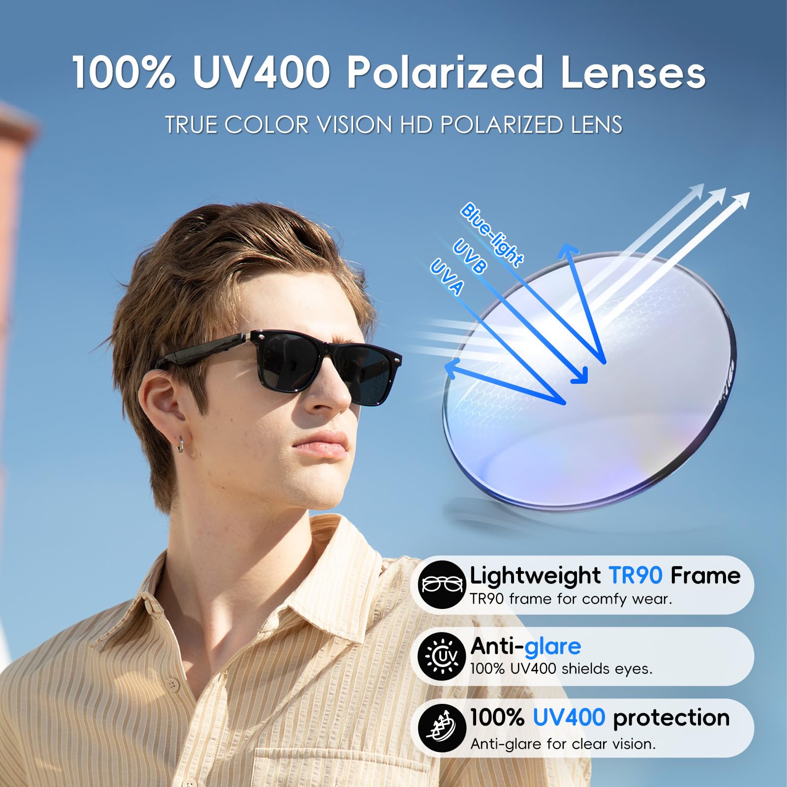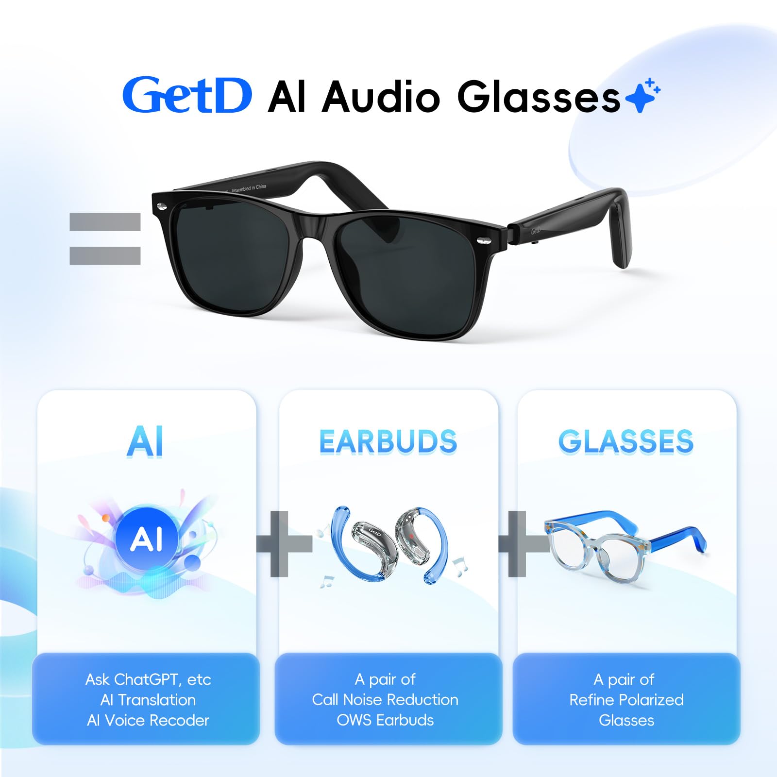 AI Glasses for Men & Women, Smart Large, Polished Black + Gray Polarized Lens Product Features 【3-IN-1 AI GLASSES】: ①Your AI Assistant powered by ChatGPT, Real-time Translation and Voice Recorder; ②A Pair of Good OWS Noise Reduction Earbuds; ③A Pair of Good Polarized Sunglasses for Men & Women 【AI ASSISTANT GLASSES】: Integrated into the GetD…